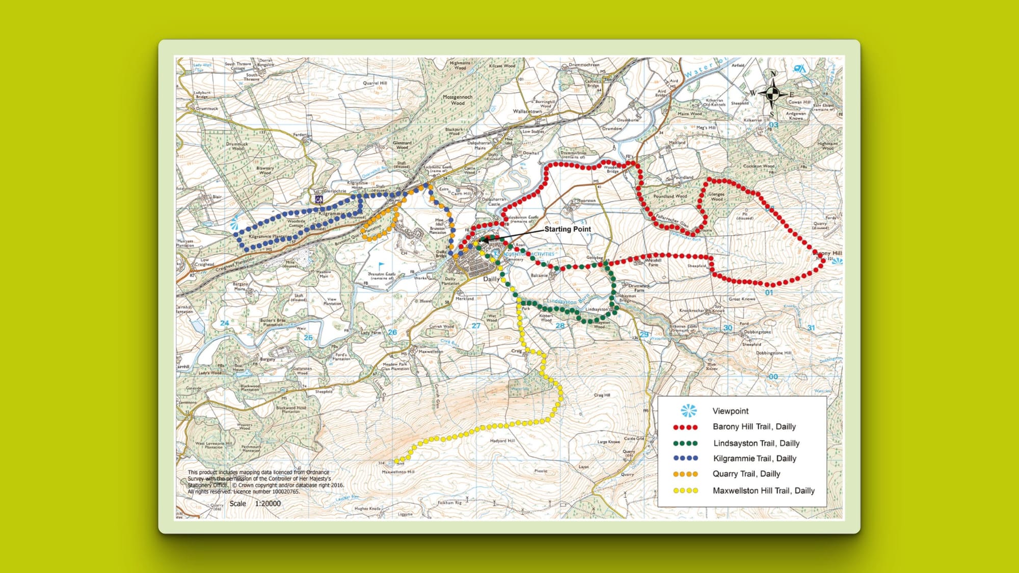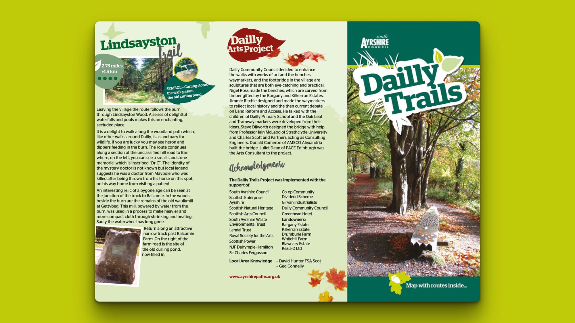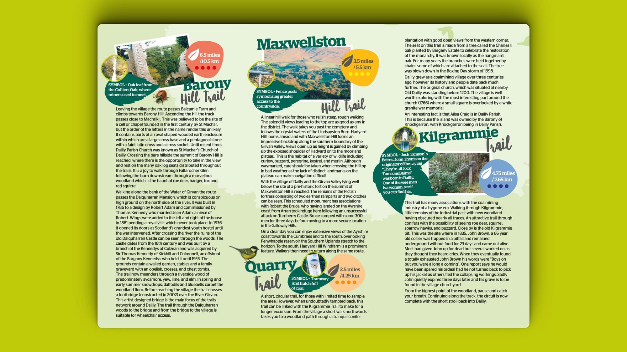Dailly Trail Leaflets with map are available in the Community Hall, the Dailly Store and Morrison's Dailly in the village.