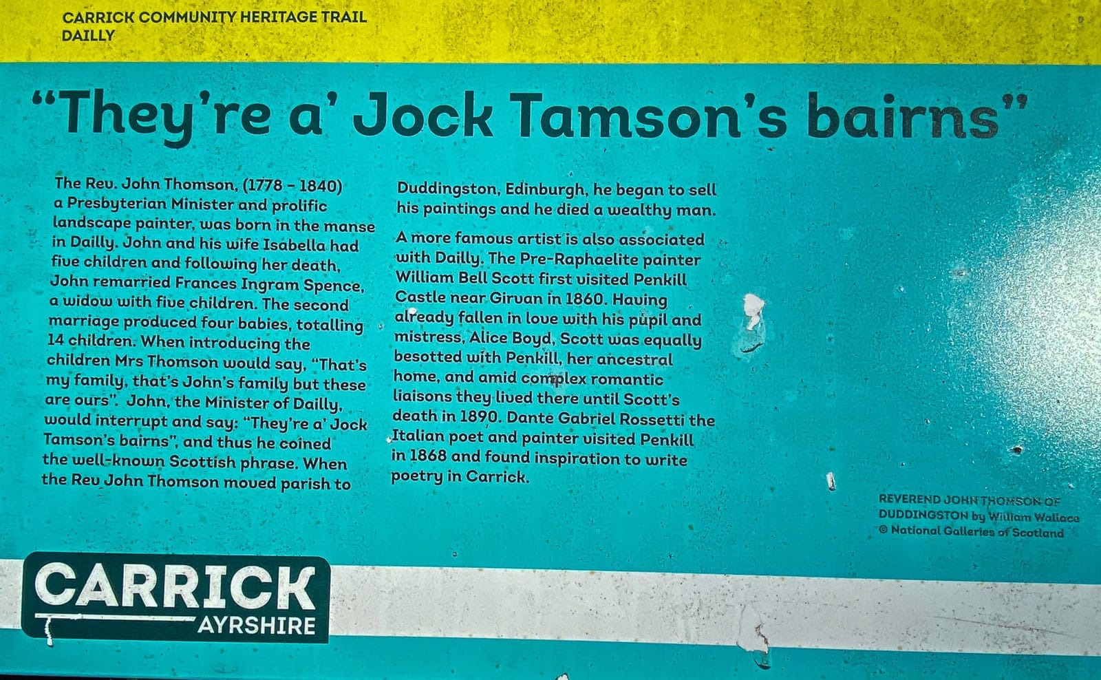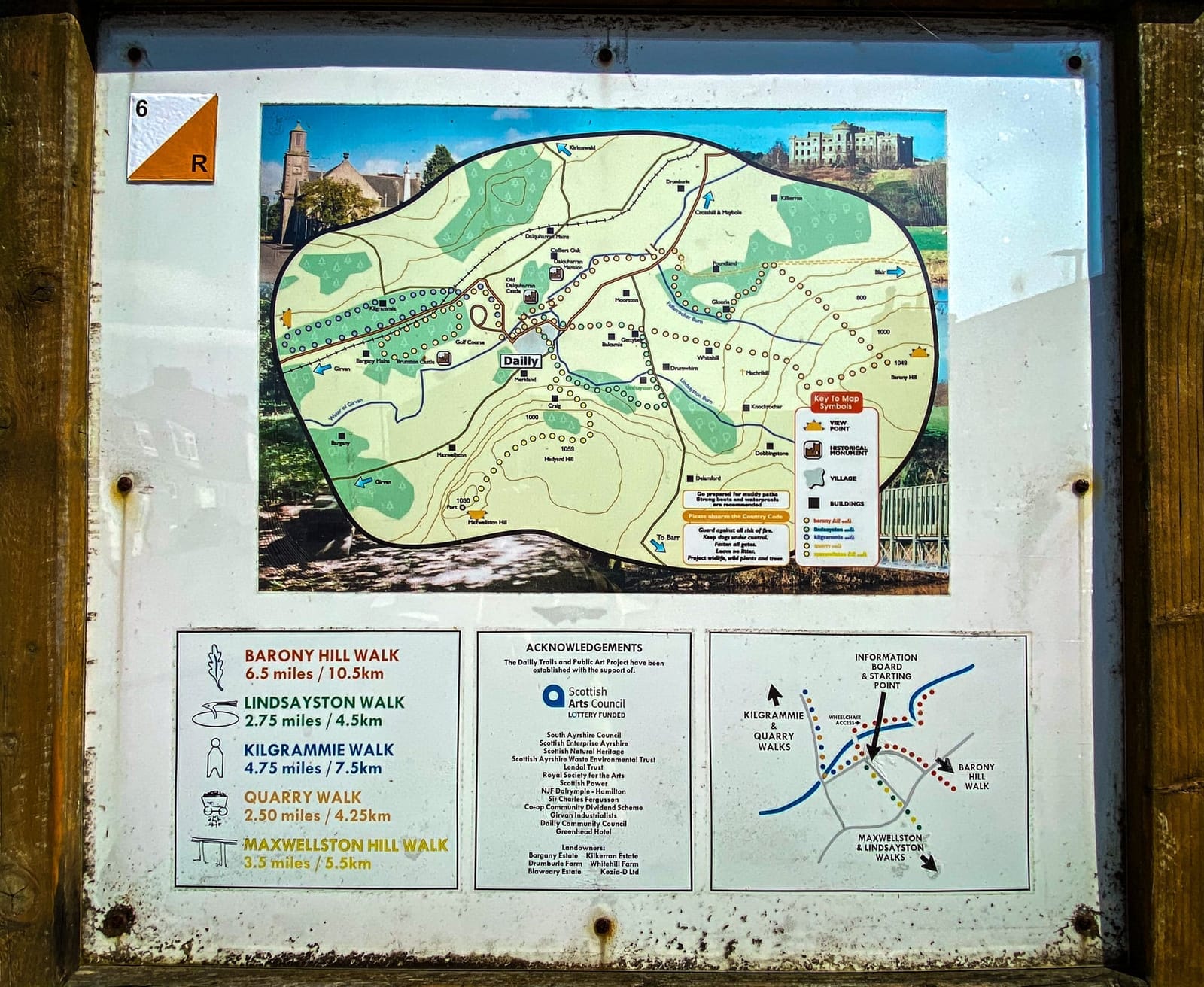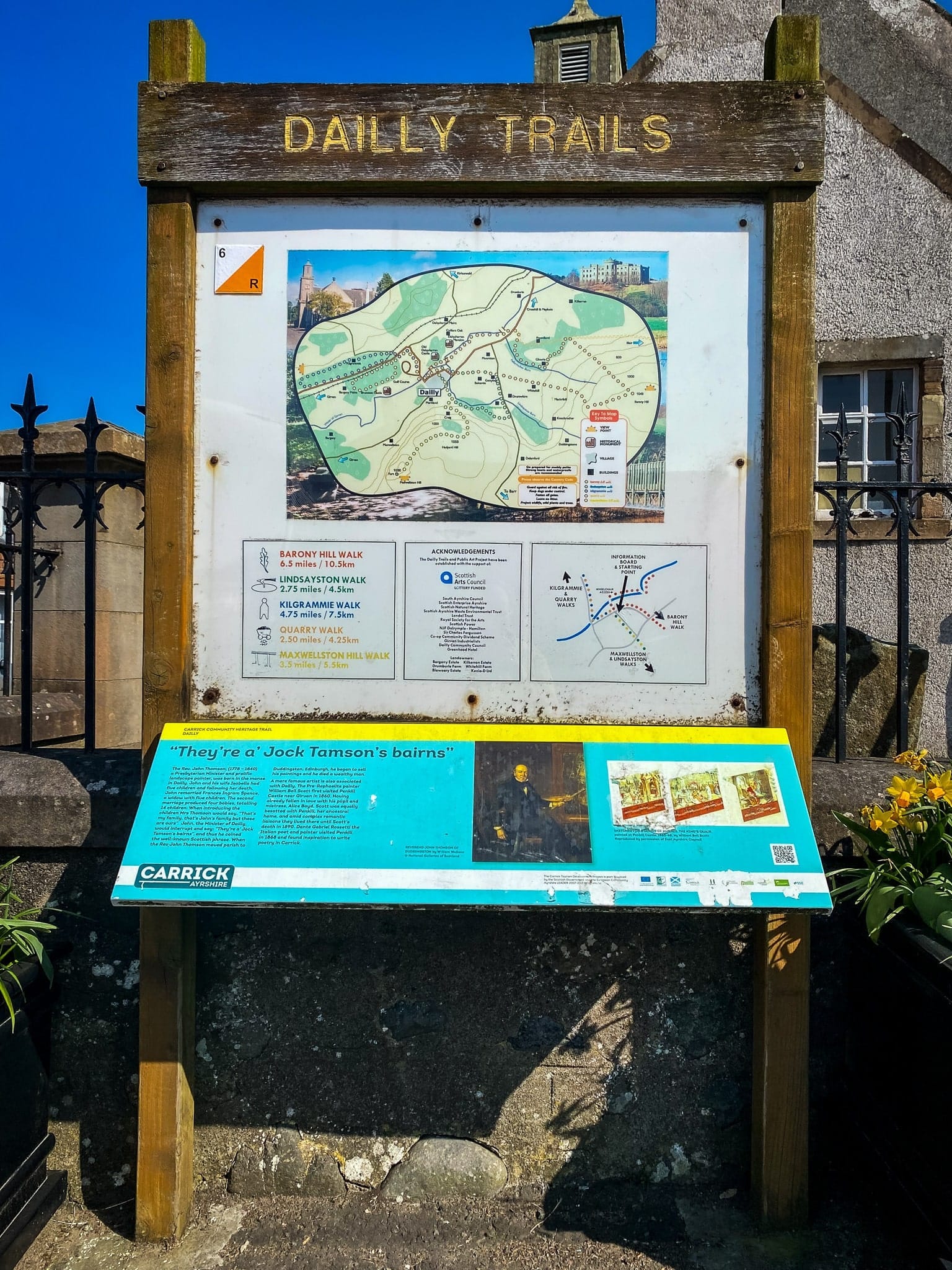The Dailly Trails information board can be found in the Square in Dailly, on the Main Street, by the Church. Photos of which are below.