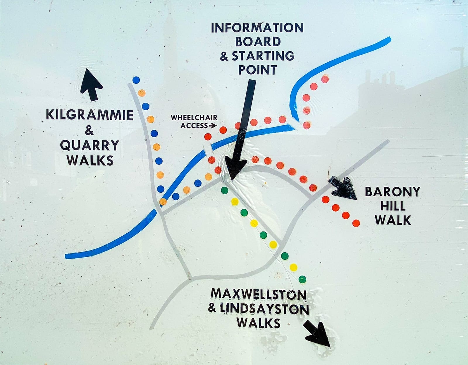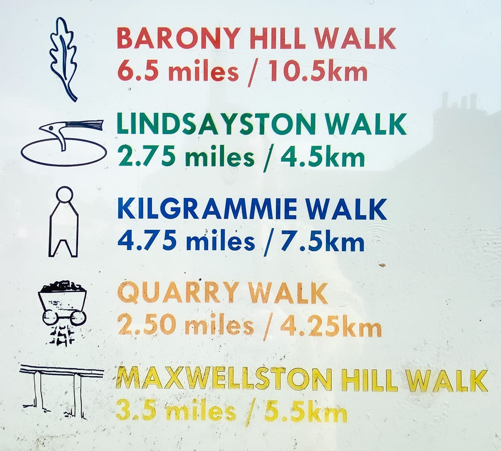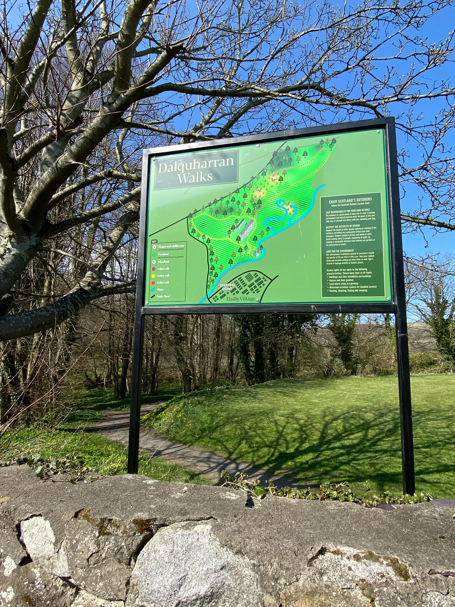 Each trail route originates in the Village Square, off Main Street at the information board, except for the Dalquharran Estate Walks. The Walks begin at the notice board opposite the Primary School at Memorial Park on Main Street, Dailly.