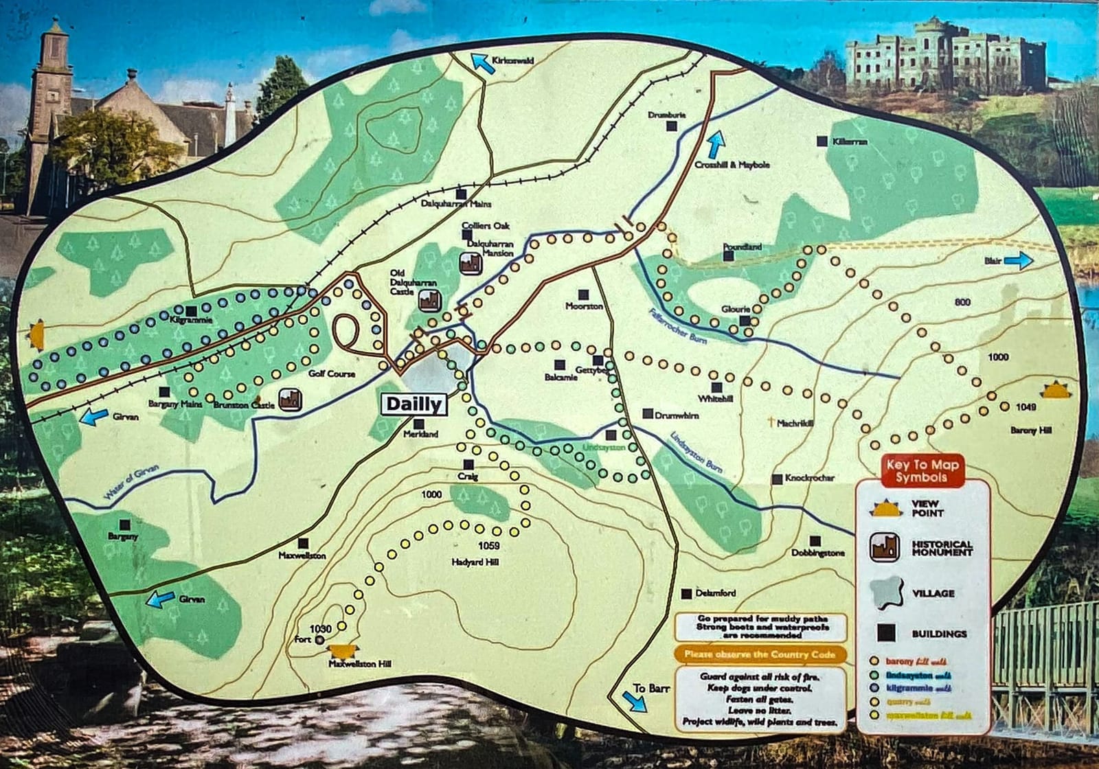 Five main trails (plus Dalquharran Estate Walks) with distinctive way-markers have been established in the Girvan Valley, each route originating in the Dailly Village Square.